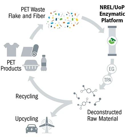 NREL 大学と UoP の科学者は、使用済み PET を同一の化学構成要素であるテレフタル酸 (TPA) とエチレングリコール (EG) に迅速に分解できる、費用対効果が高く環境に優しい酵素プラットフォームを開発しました。