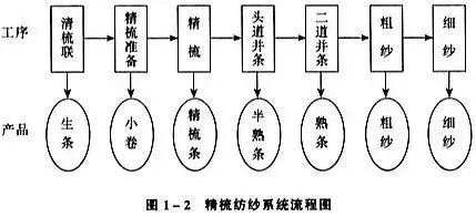 コーミング システムは、高級綿糸、特殊糸、または綿と化学繊維の混紡糸を紡績するために使用されます。コーミングシステムの工程と半製品、完成品の名称を下図に示します。
