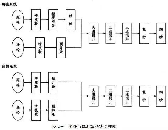 ポリエステル(または他の化学繊維)と綿を混紡する場合、ポリエステルと綿の繊維の性質や不純物が異なるため、ラブレタープロセスで混合して加工することができず、格子状の短冊を作成してから、最初の道路描画機で混合する (混合) 場合、確実に混合するには 3 つの平行なストリップが必要です。一般的なコーミングとコーミング紡績の工程の流れを下図に示します。