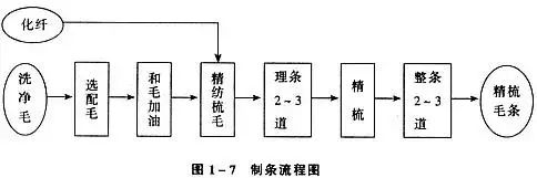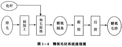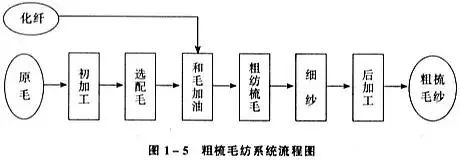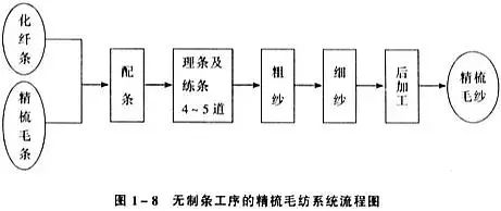 一部のコーマウール工場には、原料としてコーマウールストリップを使用するストリップ製造プロセスがなく、生産プロセスには前紡績と後紡績が含まれます。ほとんどの工場では、ストリップ染色とリコーミングの工程を行っていません。ストリップ染色とコーミング工程は、ウールを染色した後の 2 回目のコーミングのことを指します。リコーミング工程は、ストリップを作る工程に似ています。ダブルコーマ工程を行わないコーマウール紡績システムの流れを図1-8に示します。また、コーマとコーマの間にはセミコーマ紡績という工程体系があります。