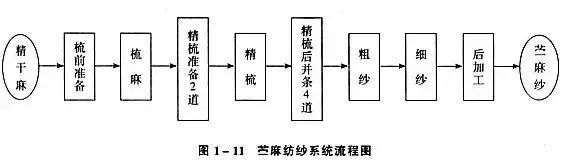 一般に、コーマウールまたはシルクの紡績システムは借用され、設備は局所的な改良のみが行われます。生の麻はまず前処理され、細かい麻に加工されます。その紡績プロセスは下の図に示されています。短いラミーとカラマツは通常、綿紡績システムで加工できます。